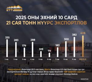 9 дүгээр сард хамгийн өндөр буюу 3,2 сая тонн нүүрс экспортлов